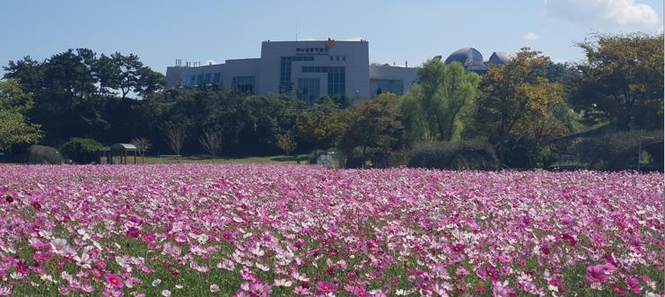 (해남=연합뉴스) 13일 전남 해남공룡박물관이 가을빛이 찬란한 코스모스 물결로 가득 찼다.