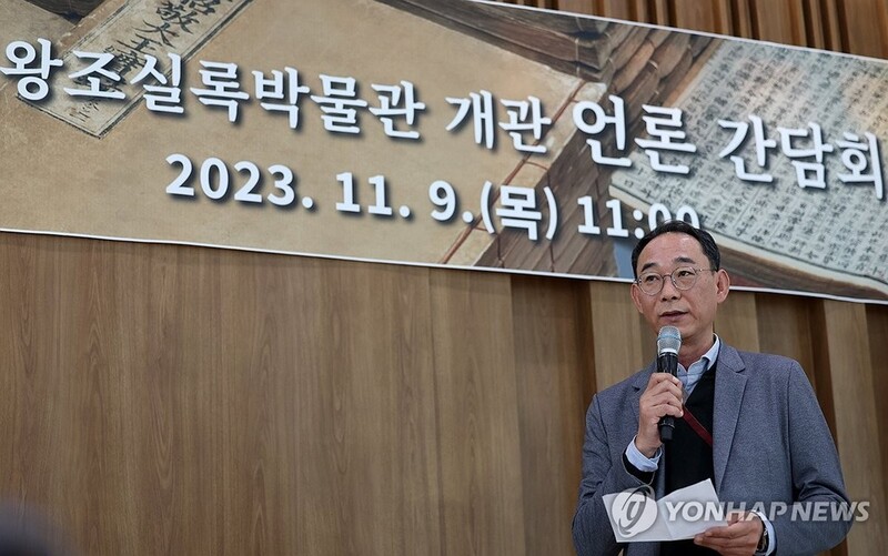 | ▲ 국립조선왕조실록박물관 개관 언론간담회 (평창=연합뉴스) 양지웅 기자 = 9일 강원 평창군 국립조선왕조실록박물관에서 열린 개관 언론간담회에 참석한 노명구 관장 직무대리가 인사말을 하고 있다. 문화재청은 조선왕조실록과 조선왕조 의궤를 보관·전시하는 박물관인 국립조선왕조실록박물관을 이달 12일 정식 개관할 계획이다. 2023.11.9 yangdoo@yna.co.kr |