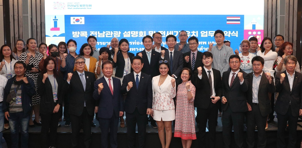 (무안=연합뉴스) 장덕종 기자 = 태국을 방문 중인 김영록 전남도지사와 국내여행사·태국여행사는 16일 수도 방콕 칼튼호텔에서 열린 전남 관광설명회에서 방콕∼무안국제공항 전세기 운항 업무협약을 했다.