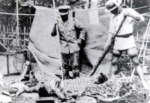 | ▲ 해외교포문제연구소가 2005년 11월 서울 혜화동 대학로 국제 디자인 프라자 3층 전시관에서 개최한 '재일동포 100년 역사 사진전' 때 관동대지진 당시 조선인 학살 장면으로 소개된 사진. [DB화 및 재배포 금지] |
