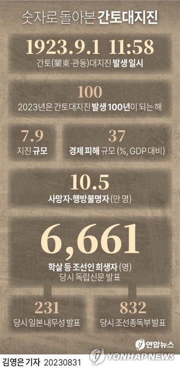 | ▲ [그래픽] 숫자로 돌아본 간토대지진 (서울=연합뉴스) 김영은 기자 = 0eun@yna.co.kr 트위터 @yonhap_graphics 페이스북 tuney.kr/LeYN1 |