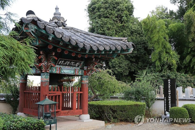 | ▲ 일본 야치요 간논지 보화종루와 조선인 희생자 위령비 (야치요=연합뉴스) 박상현 특파원 = 일본 지바현 야치요 소재 사찰인 간논지(觀音寺)의 보화종루와 간토대지진 조선인 희생자 위령비. |