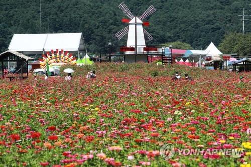 | ▲ '천만 송이의 유혹'…평창 백일홍축제 (평창=연합뉴스) 이재현 기자 = 8일 강원 평창군 평창읍 제방길 일원에 마련된 2022평창백일홍축제장을 찾은 관광객이 30만㎡의 꽃밭에 핀 천만 송이의 백일홍꽃밭에서 여유로운 시간을 보내고 있다. 2022.9.8 jlee@yna.co.kr |