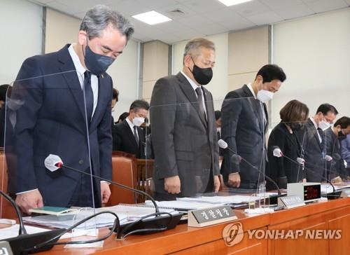| ▲ National Police Agency Commissioner General Yoon Hee-keun (from L to R), Interior Minister Lee Sang-min, Seoul Mayor Oh Se-hoon and Yongsan Ward office chief Park Hee-young bow in a silent tribute to the victims of the Itaewon crowd crush during a parliamentary session on Nov. 7, 2022. (Yonhap) |