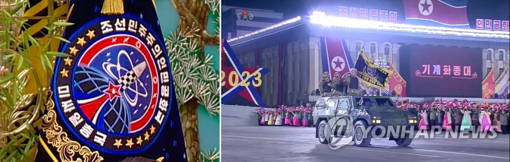 | ▲ These images, captured from footage of North Korea's state-run Korea Central Television on Feb. 15, 2023, shows the flag of the Missile General Bureau (L) and a vehicle carrying the flag rolling through Kim Il Sung Plaza during a military parade in February. (For Use Only in the Republic of Korea. No Redistribution) (Yonhap) |