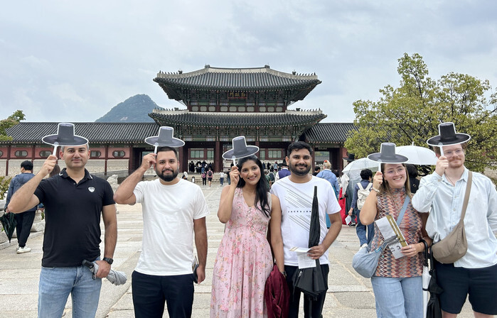 Foreign tourists pose for a photo holding souvenir fans shaped like a traditional Korean hat, or "gat," at Gyeongbok Palace in central Seoul on Oct. 3, 2025, in this photo provided by the Cultural Heritage Administration. (PHOTO NOT FOR SALE) (Yonhap)