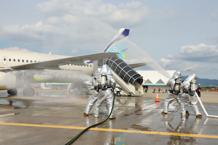 An airplane collision simulation training exercise is underway at Gimhae International Airport in the southern city of Busan on Sept. 26, 2024. (Yonhap)