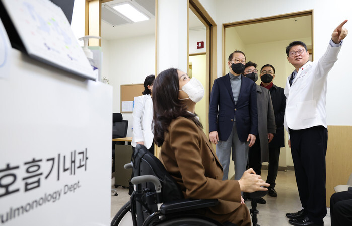 Kwon Young-se (L, rear), chief of the ruling People Power Party's emergency leadership committee, visits a hospital of the Inbong Medical Foundation in Seoul on Jan. 27, 2025, to check on the country's emergency medical system on the third day of a six-day break for Seol, or Lunar New Year, which falls on Jan. 29. (Yonhap)