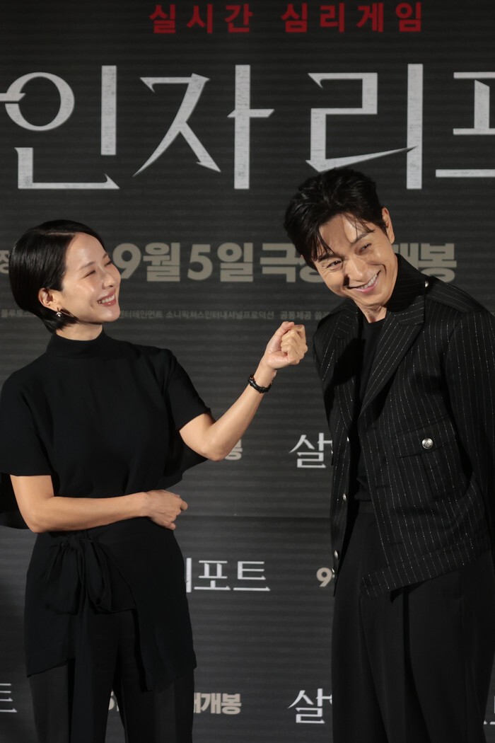 South Korean actor Jung Sung-il and actress Jo Yeo-jung, who star in the new movie "Murder Report," pose for a photo during a publicity event in Seoul on Aug. 12, 2025, to promote the movie, set to hit local screens in South Korea on Sept. 5. (Yonhap)