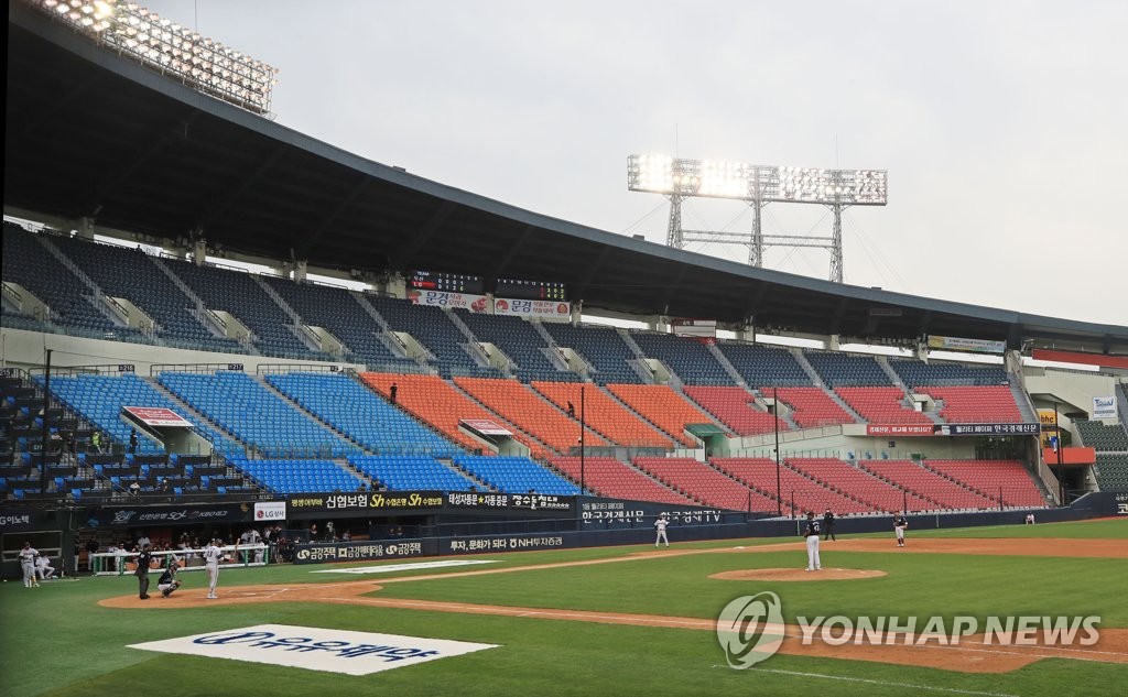 | ▲ In this file photo taken on May 5, 2020, the opening game of the 2020 season of the Korea Baseball Organization (KBO) takes place between the Doosan Bears and the LG Twins at Jamsil Stadium in Seoul without spectators amid the COVID-19 pandemic. (Yonhap) |