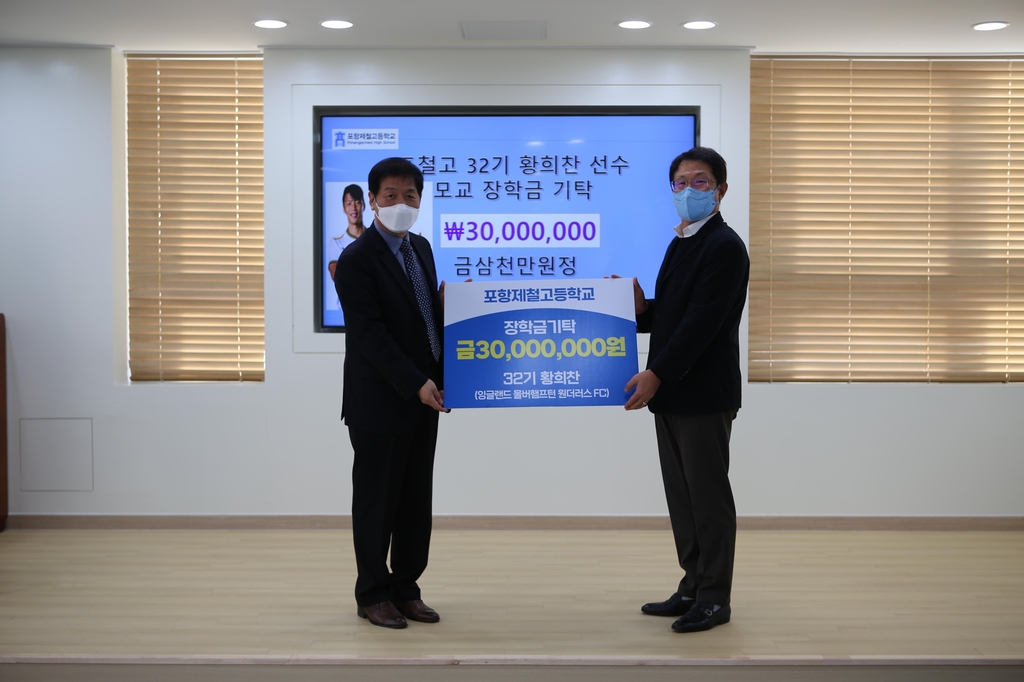 15일 포스코교육재단에 따르면 이날 오전 포철고 역사관에서 황희찬 선수를 대신해 아버지 황원경 씨가 포스코교육재단을 통해 포항제철고 발전 기금 3천만 원을 전달했다.