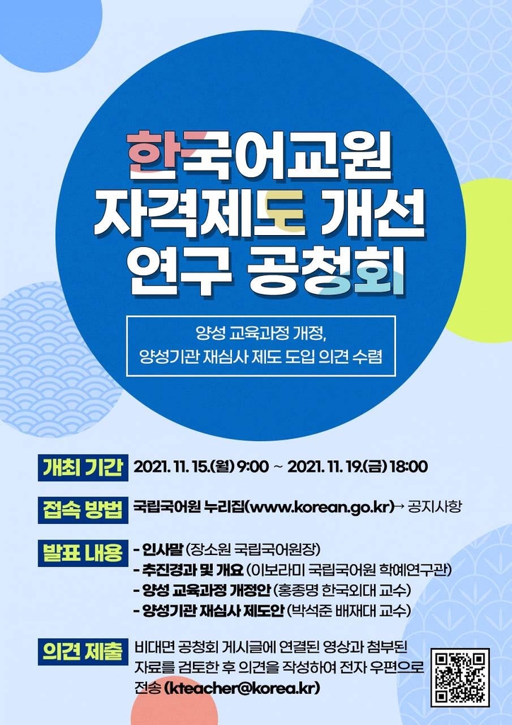 ▲ 한국어교원 제도 개선 공청회 = 국립국어원은 15∼19일 온라인으로 '한국어교육 자격제도 개선 연구 공청회'를 개최한다.