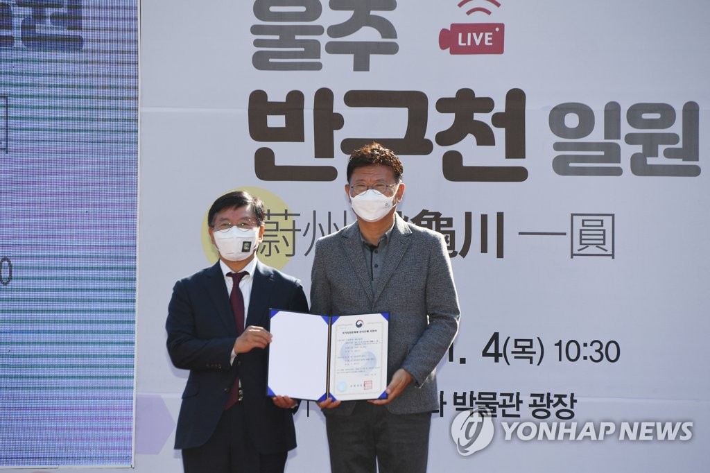▲ '울주 반구천 일원' 명승 지정서 전달하는 문화재청장 (서울=연합뉴스) 김현모 문화재청장(왼쪽)이 4일 오전 울산 암각화 박물관에서 열린 '울주 반구천 일원'의 명승 지정 기념행사에서 이선호 울주군수에게 지정서를 전달한 후 기념 촬영을 하고 있다. 2021.11.4 [문화재청 제공. 재판매 및 DB 금지] photo@yna.co.kr