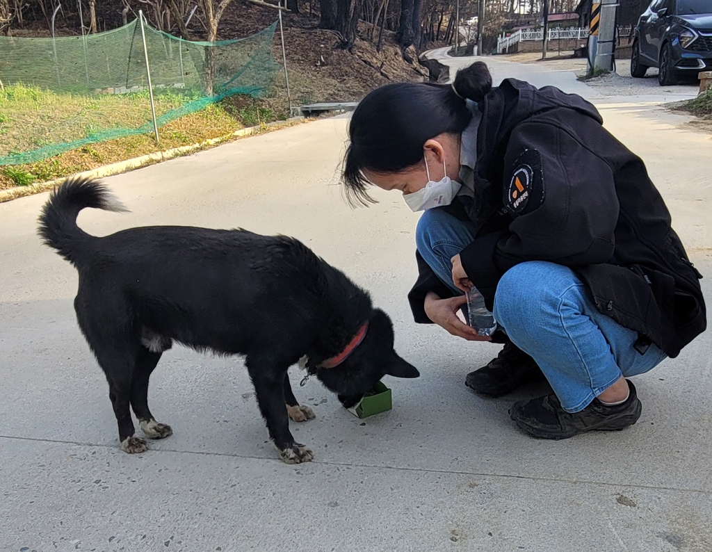 | ▲ 주인 잃은 반려견에게 사료 주는 동물자유연대활동가 [동물자유연대 제공. 재판매 및 DB 금지] |
