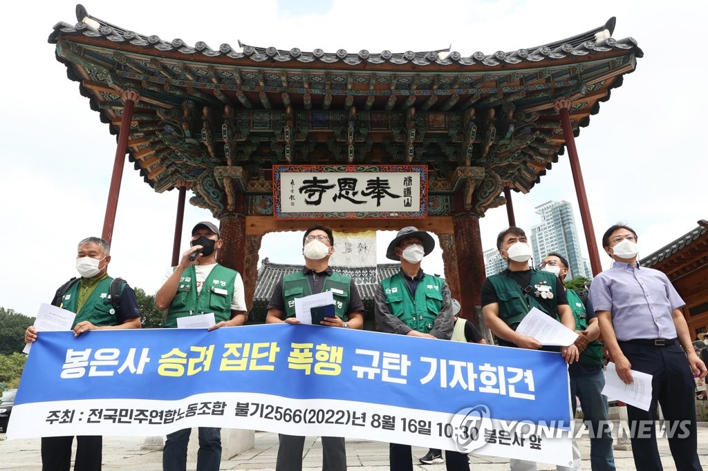 | ▲ 봉은사 승려 집단 폭행 규탄 기자회견 (서울=연합뉴스) 진연수 기자 = 전국민주연합노동조합원들이 16일 서울 강남구 '봉은사 앞에서 봉은사 승려 집단 폭행 규탄 기자회견'을 하고 있다. 2022.8.16 jin90@yna.co.kr |