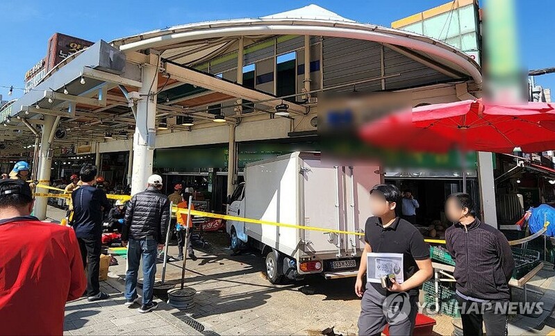 The truck crossed a sidewalk and hit a store at Moran Traditional Market in Seongnam at around 12:15 p.m. before coming to a stop.