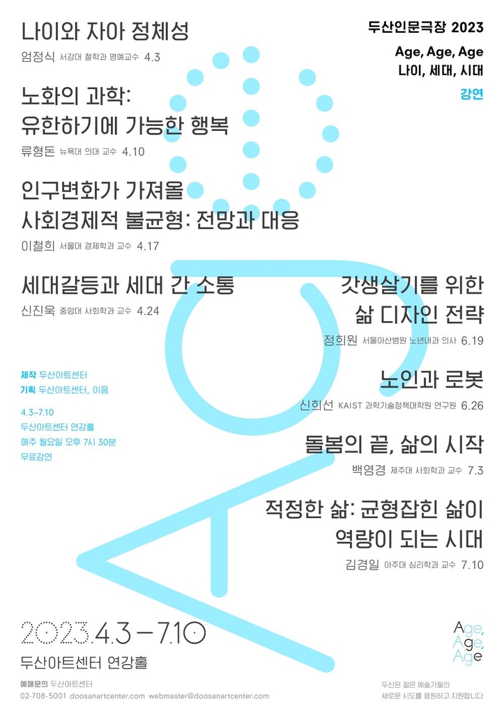 다음 달 3일 엄정식 서강대 철학과 명예교수의 '나이와 자아 정체성' 강의를 시작으로 류형돈 뉴욕대 의대 교수, 이철희 서울대 경제학과 교수, 정희원 서울아산병원 노년내과 교수 등이 두산아트센터 연강홀 무대에 오른다.