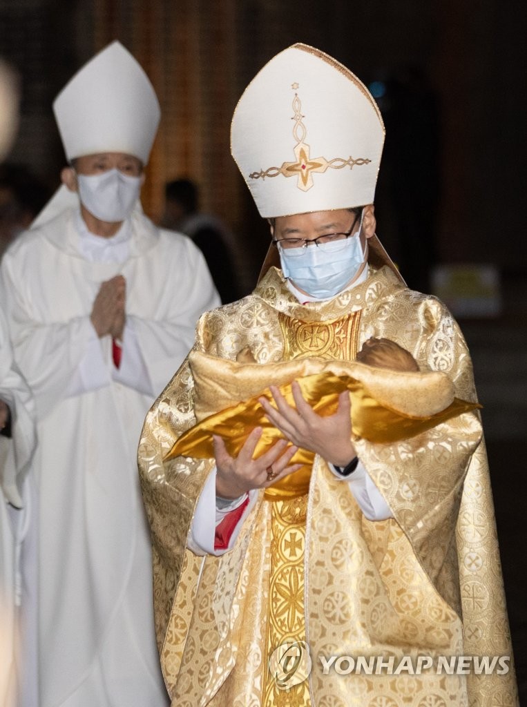 정 대주교는 미사에 앞서 24일 오후 11시 56분께 아기 예수를 말 구유에 안치하는 예식인 '구유예절'을 행했다.