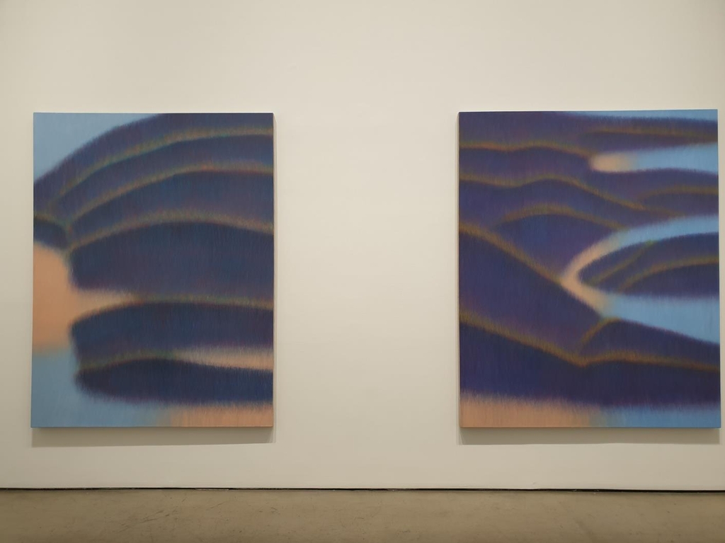 2층에는 날씨에 따라 달라지는 하늘과 구름을 표현한 그림들이 걸렸다. 파란 하늘에 구름이 한 조각 지나가는 모습이나 해가 떠오르는 모습처럼 금방 사라지는 순간들을 수많은 색의 레이어를 쌓아 그러데이션(gradation. 하나의 색이 다른 색으로 변하는 기법) 방식으로 재현한다.