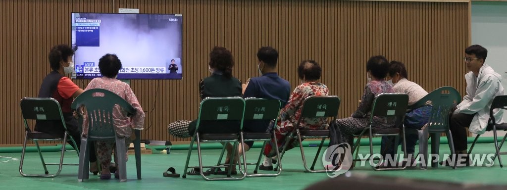 ▲ People watch the weather forecast at a temporary shelter in hard-hit north Gyeongsang Province on July 18, 2023. (Yonhap)