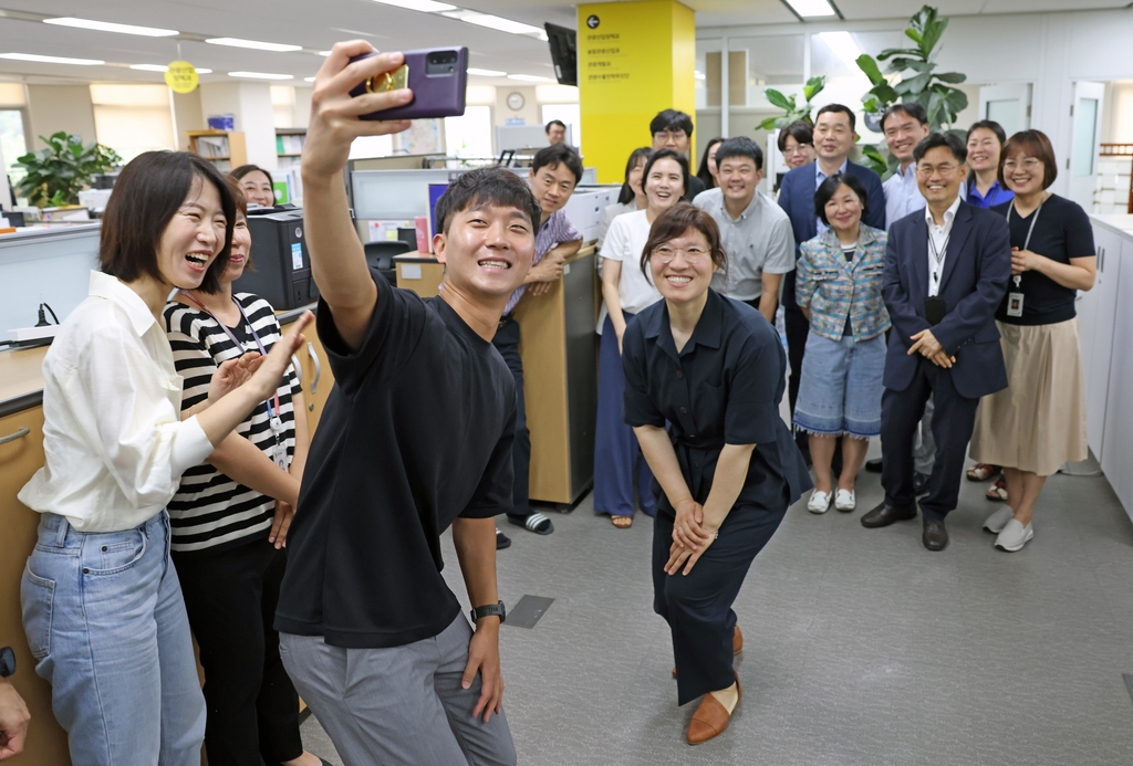 | ▲ 문체부 직원들과 기념 촬영하는 장미란 문체부 2차관 (서울=연합뉴스) 장미란 문화체육관광부 제2차관이 4일 정부세종청사 15동 문체부로 출근해 사무실을 돌며 직원들과 인사를 나누고 기념촬영을 하고 있다. [문화체육관광부 제공] |