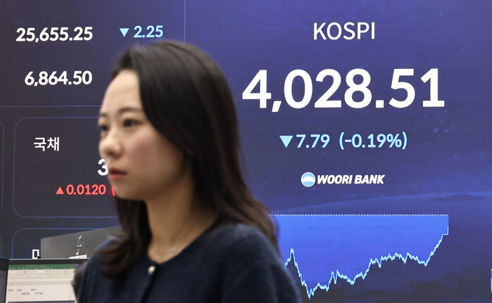 A financial data screen in the dealing room of Woori Bank in Seoul on Dec. 4, 2025, shows the benchmark Korea Composite Stock Price Index having slipped 7.79 points, or 0.19 percent, to close at 4,028.51. South Korean stocks closed slightly lower as renewed concerns over stretched valuations in artificial intelligence weighed on major chipmakers despite auto gains. (Yonhap)