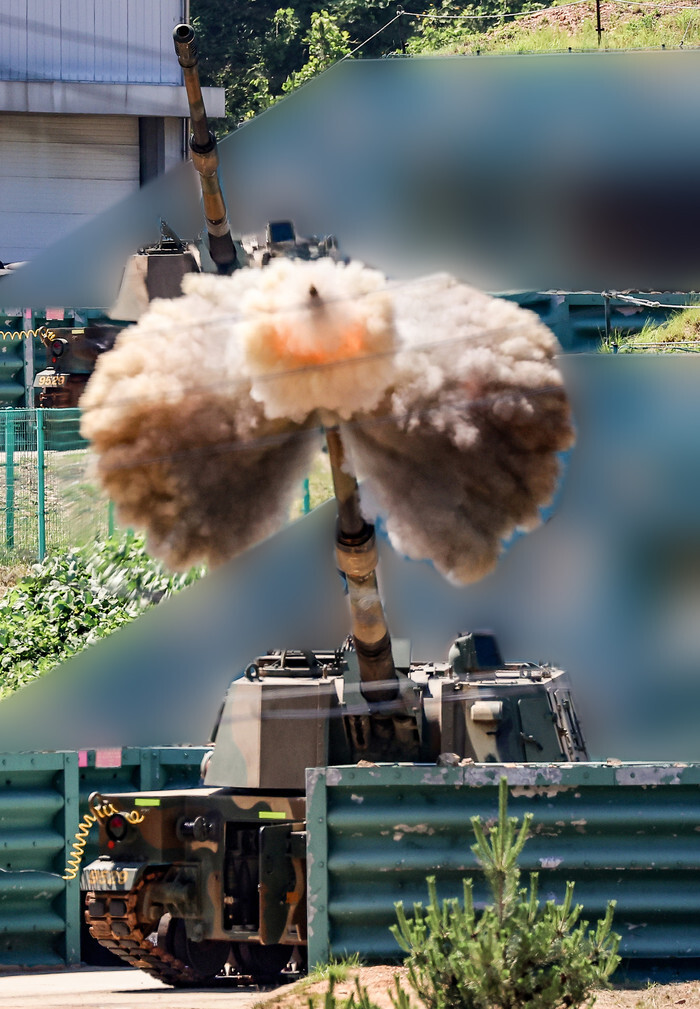 K9 howitzers fire shells toward the sea off Yeonpyeong Island bordering North Korea on June 26, 2024, marking the reopening of live-fire drills for the first time in seven years following South Korea's suspension of the inter-Korean military accord signed in 2018, prompted by a series of recent North Korean provocations. (Yonhap)