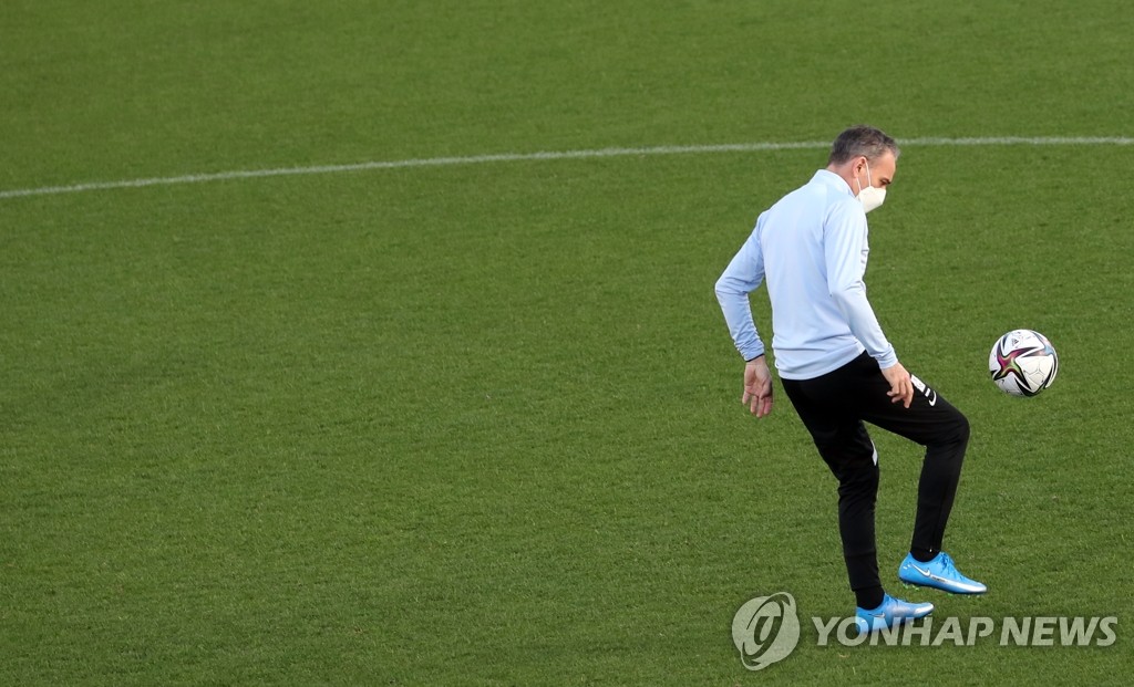 | ▲ Paulo Bento, head coach of the South Korean men's national football team, kicks the ball during practice at a facility in Yokohama, Japan, on March 23, 2021. (Yonhap) |