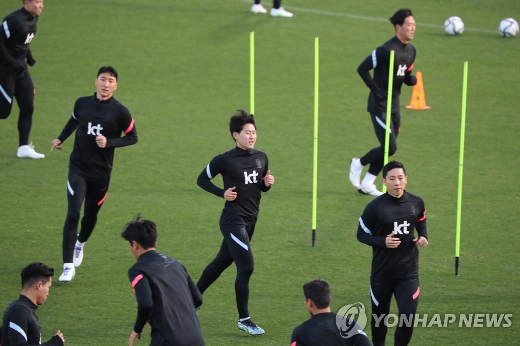| ▲ Members of the South Korean men's national football team train at a facility in Yokohama, Japan, on March 23, 2021, in preparation for a friendly match against Japan. (Yonhap) |