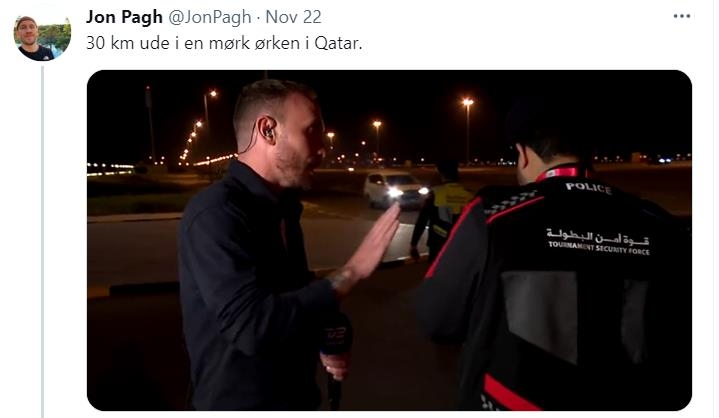 소셜미디어에 공개된 영상을 보면 덴마크 선수단의 숙소 주변에서 리포트를 촬영 중이던 그에게 현지 경찰이 다가와 이 완장을 벗으라고 요구했다.
