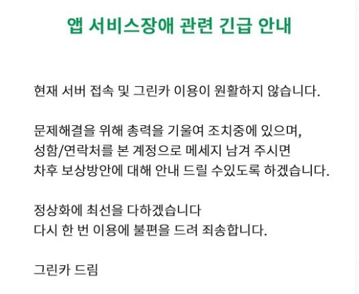 그린카는 앱이 먹통이 된 지 2시간이 지나서야 인스타그램 계정에 사과문을 올리고 "서버 접속 및 그린카 이용이 원활하지 않다"고 공지했다.