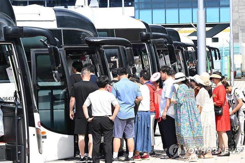 | ▲ 버스 탑승하는 중국 단체관광객 (제주=연합뉴스) 중국 단체관광객을 태운 크루즈 상하이 블루드림스타호(2만4천782t)가 31일 오후 제주항에 입항했다. 입국 수속을 마친 중국 관광객들이 시내관광을 위해 버스에 탑승하고 있다. 2023.8.31 [제주도사진기자회] jihopark@yna.co.kr |