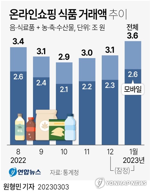 김서영 통계청 서비스업동향과장은 "온라인 장보기의 편리함 때문에 온라인 음·식료품 거래액이 계속 늘어나는 추세"라며 "지난 1월에는 설 명절이 포함돼 특히 음·식료품 소비가 많았다"고 설명했다.