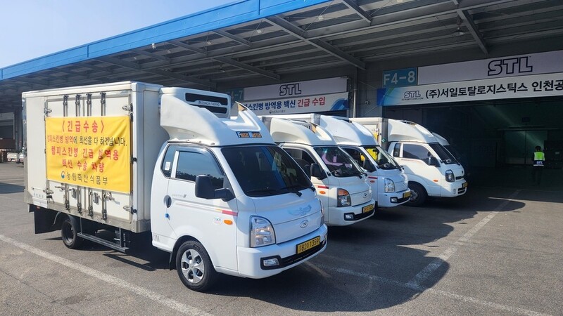 | ▲ This photo provided by the Ministry of Agriculture, Food and Rural Affairs shows trucks carrying lumpy skin disease vaccine shots in Incheon, west of Seoul, on Oct. 28, 2023. (PHOTO NOT FOR SALE) (Yonhap) |