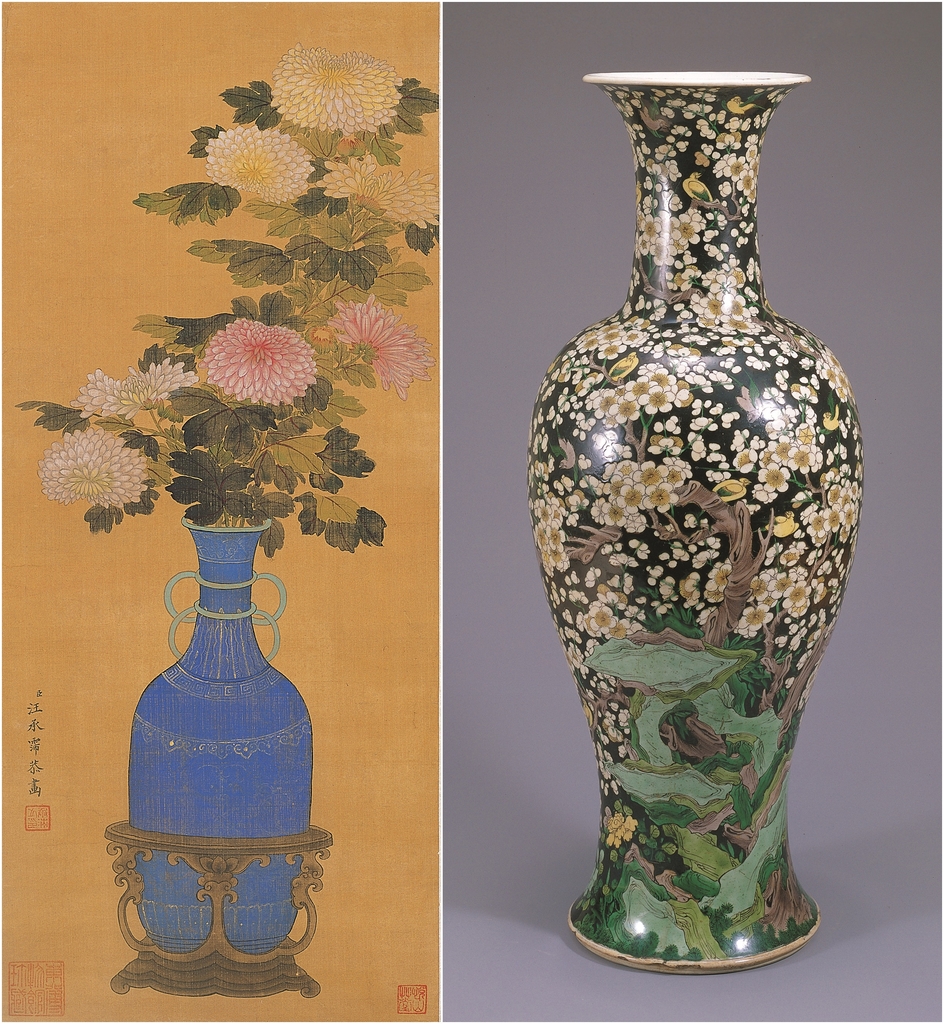 | ▲ 주요 전시품 왼쪽부터 '국화' 그림, '흑지분채매화문병(黑地粉彩梅花文甁) 모습 [화정박물관 제공. 재판매 및 DB 금지] |
