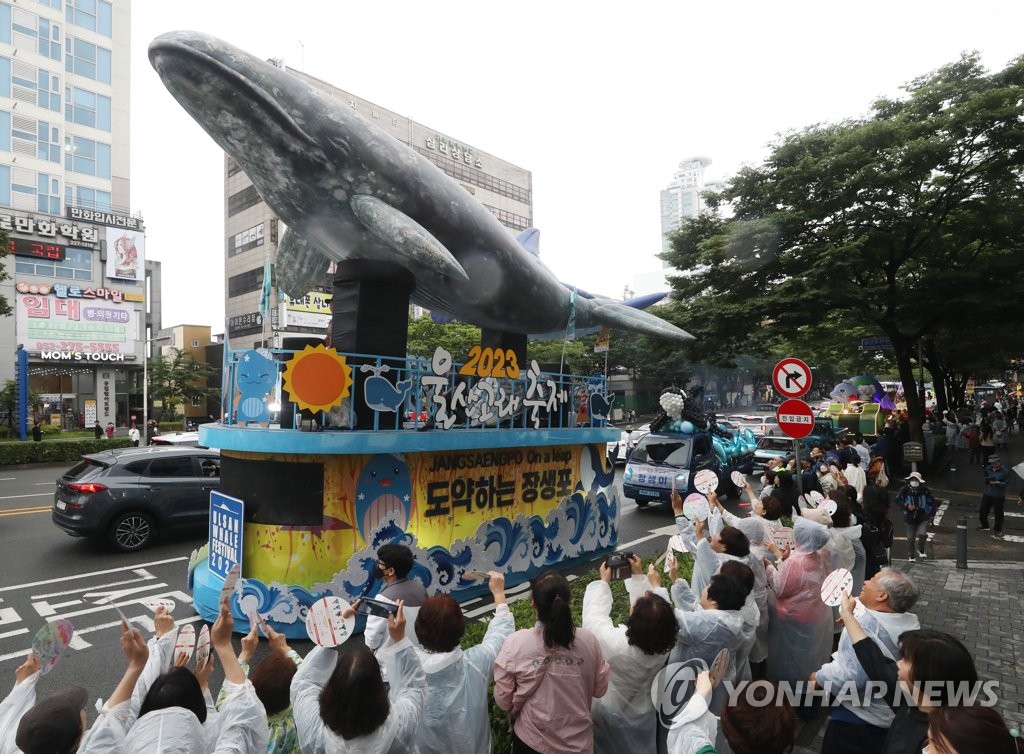 | ▲ 울산공업축제 거리 퍼레이드에 등장한 고래 (울산=연합뉴스) 김용태 기자 = 1일 오후 울산시 남구 도로에서 시민들이 '2023 울산공업축제' 거리 퍼레이드를 지켜보고 있다. 시민 1천명가량이 참여한 이번 행사는 울산 5개 구·군의 대표 축제와 모빌리티 역사 구현, 외국인 주민 공연, 울산 3대 주력산업(자동차·조선·석유화학) 카퍼레이드 등 다양한 볼거리를 담았다. 2023.6.1 yongtae@yna.co.kr |