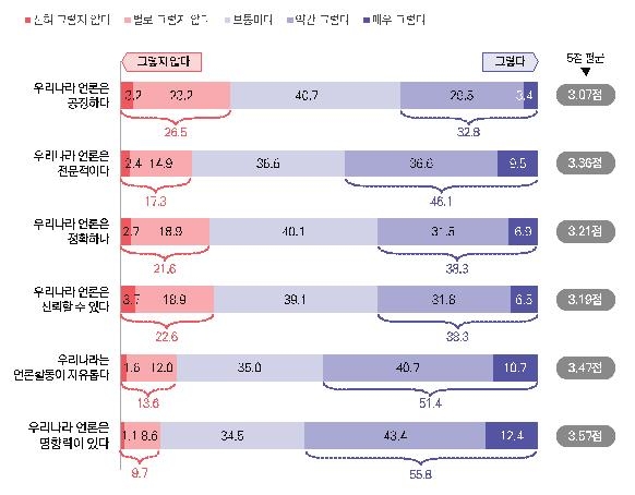 언론 역할 중요도 조사에서는 '사회 현안에 대한 정확한 정보 제공'(5점 척도 평균 4.09점), '사회 현안에 대한 다양한 의견 제시'(4.03점), '정부·국회의원·고위 공직자 등 공인에 대한 비판 및 감시'(4.03점)를 꼽았다.