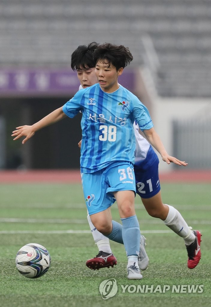 | ▲ In this file photo from July 20, 2020, Jang Chang (L) of Seoul WFC battles Mok Seung-yeon of Hwacheon KSPO WFC during their WK League match at Mokdong Stadium in Seoul. (Yonhap) |