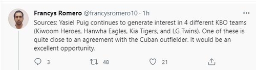 | ▲ 푸이그에게 관심을 보인 KBO리그 4개 팀을 지목한 로메로 기자 [프랜시스 로메로 기자 트위터 캡처. 재판매 및 DB금지] |