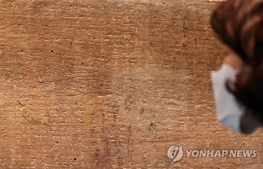 | ▲ 한석봉 글씨의 '의열사기' 현판 (서울=연합뉴스) 이재희 기자 = 18일 오전 서울 종로구 국립고궁박물관에서 열린 특별전 '조선의 이상을 걸다, 궁중현판' 전시간담회에서 참석자가 '의열사기' 현판을 살펴보고 있다. 2022.5.18 scape@yna.co.kr |