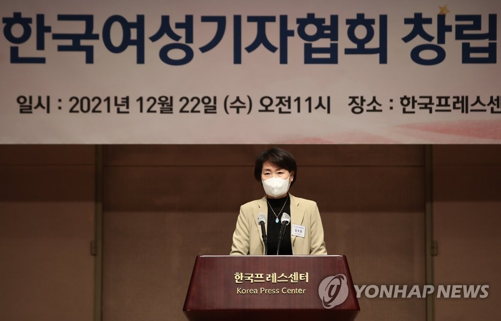 ▲ 환영사하는 김수정 한국여성기자협회장 (서울=연합뉴스) 진연수 기자 = 김수정 한국여성기자협회장이 22일 서울 중구 프레스센터에서 열린 한국여성기자협회 창립 60주년 기념식에서 환영사를 하고 있다. 2021.12.22 jin90@yna.co.kr