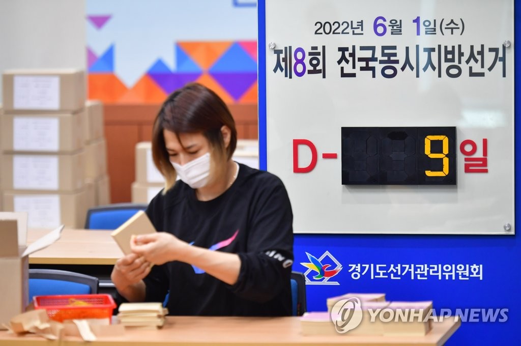 | ▲ An official of a regional office of the National Election Commission in Suwon, about 45 kilometers south of Seoul, checks ballots on May 23, 2022, in front of a sign that reads there are nine days till the June 1 local elections. (Pool photo) (Yonhap) |
