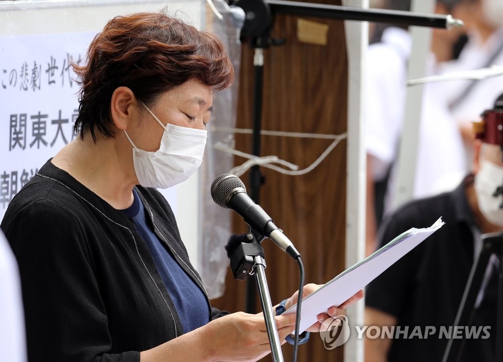 | ▲ 간토학살 도쿄 추도식 참석한 한국 시민단체 대표 (도쿄=연합뉴스) 이세원 특파원 = 1일 오전 일본 도쿄도 스미다구 소재 요코아미초공원에 있는 간토대지진 조선인 희생자 추도비 앞에서 간토대지진 99주년 조선인 희생자 추도식이 열리는 가운데 한국 시민단체 등으로 구성된 '간토학살 100주기 추도사업 추진위원회' 손미희 공동추진위원장이 추도사를 하고 있다. |
