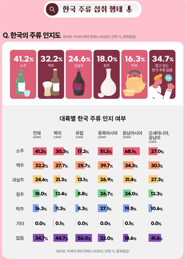 조사에서 전체 응답자의 41.2%(중복응답)는 한국 술로 '소주'를 알고 있다고 답했다.