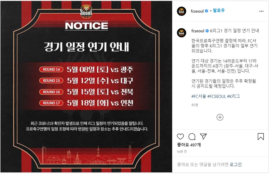 | ▲ This image from the Instagram account of FC Seoul shows the K League 1 club's notice that its games have been postponed. (PHOTO NOT FOR SALE) (Yonhap) |