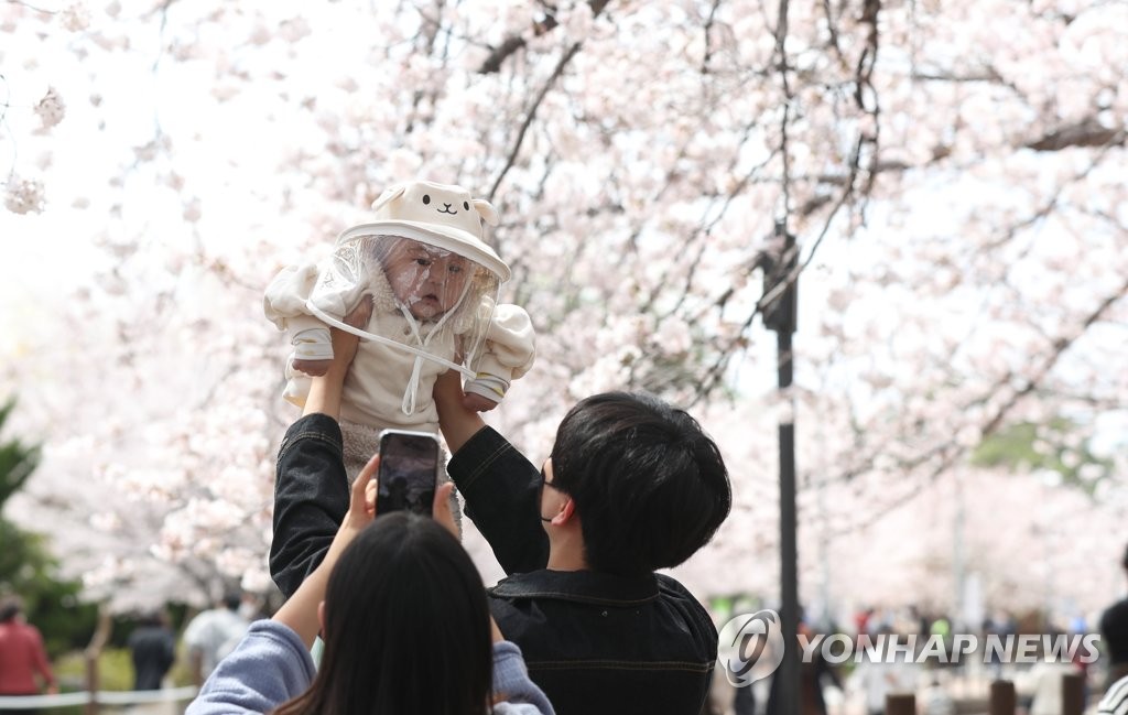 ▲ '벚꽃 추억' (창원=연합뉴스) 김동민 기자 = 금요일인 1일 오후 경남 창원시 진해구 경화역 공원을 찾은 가족이 만개한 벚꽃을 배경으로 아들과 사진 촬영하고 있다. 2022.4.1 image@yna.co.kr