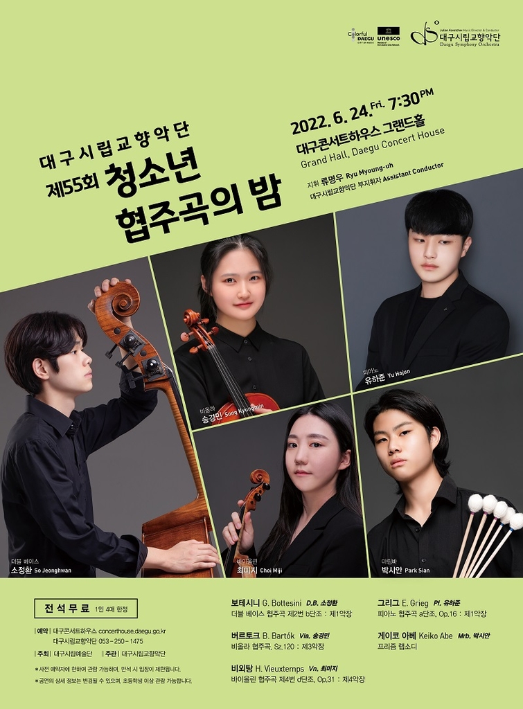 대구시향 류명우 부지휘자가 지휘하고 청소년 협연자 오디션을 거쳐 선발된 소정환, 송경민, 최미지, 유하준, 박시안이 협연한다.