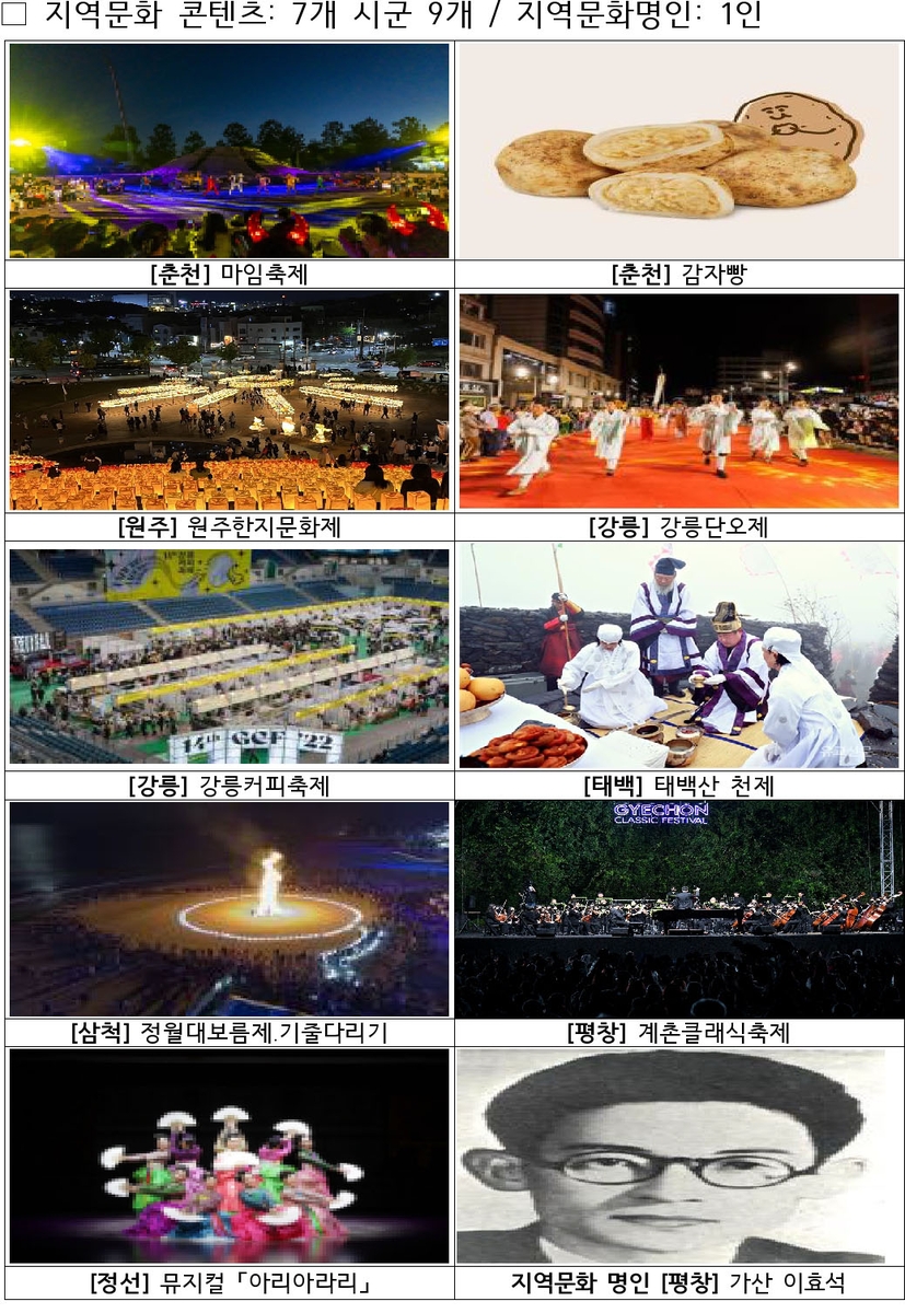 또 천년의 전통을 가진 강릉 단오제, 정선아리랑을 현대적으로 재해석한 정선 아리아라리, 춘천 마임축제 및 감자빵, 원주 한지문화제, 강릉 커피축제, 삼척 정월대보름제 줄다리기, 평창 계촌클래식축제, 태백산 천제 등 9개 문화 콘텐츠도 명단에 이름을 올렸다.