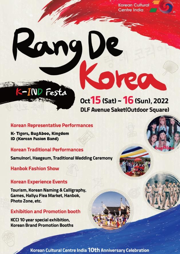15일 오전 장재복 주인도한국대사의 환영사로 문을 여는 축제는 K-팝 걸그룹인 버가부, 퓨전 국악팀 이드, K타이거즈 등의 공연과 사물놀이·해금 무대가 마련된다.