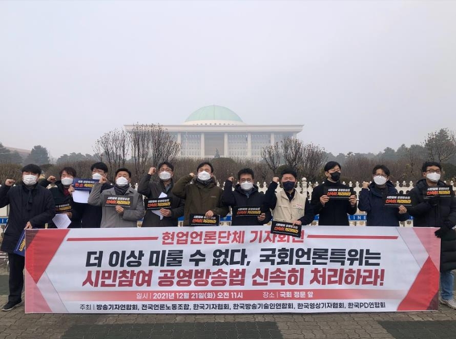 방송기자연합회·전국언론노동조합·한국기자협회·한국방송기술인연합회·한국영상기자협회·한국PD연합회 등 언론 현업단체들은 21일 국회 앞에서 기자회견을 열고 언론특위 활동 기한을 연장하고, 공영방송 지배 구조 개선 법안을 최우선으로 처리하라고 촉구했다.